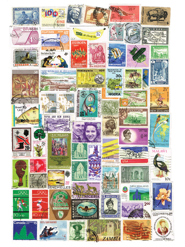 A collection of over 60 postage stamps of different shapes and sizes from New Zealand and other countries around the world.