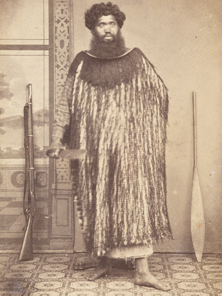 Portrait of Hetaraka Tautahi, 1860–1880. Tautahi wears a long korowai (flax fibre cloak with tassles) over a checked shirt. He holds a mere pounamu and placed beside him are a rifle and a hoe (paddle).