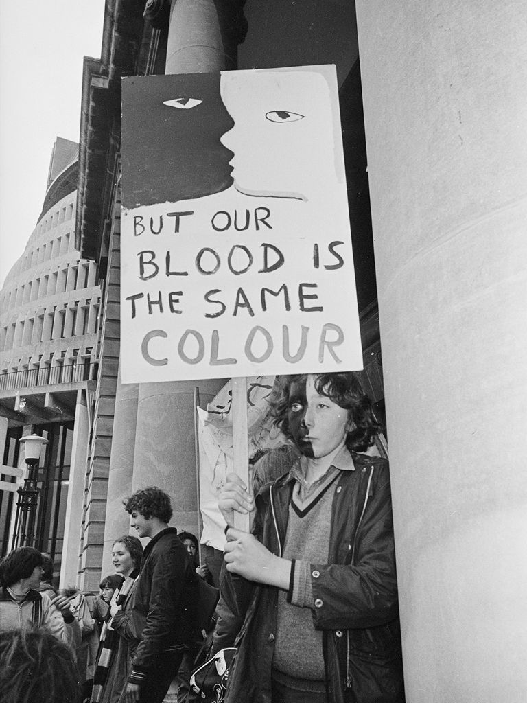 S.C.A.R. (School Children Against Racism) te hīkoi ki te Whare Pāremata, tētahi wāhanga o ngā whakahē ki ngā Tīma o Te Tonga o Āwherika, Ākuhata, 1981. E pupuri ana tētahi tama i tētahi kara, ko ngā kōrero o runga “But Our Blood is the Same Colour”. He kanohi pango, mā hoki, he mea rōpinepine i runga i te kara.