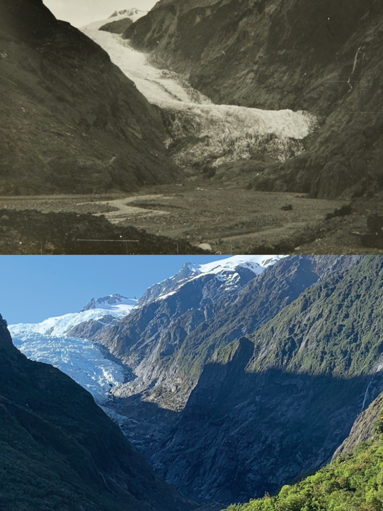 Franz Josef Glacier, 1965 (above) and 2018. The two photographs of the valley show the retreat of the glacier over time.
