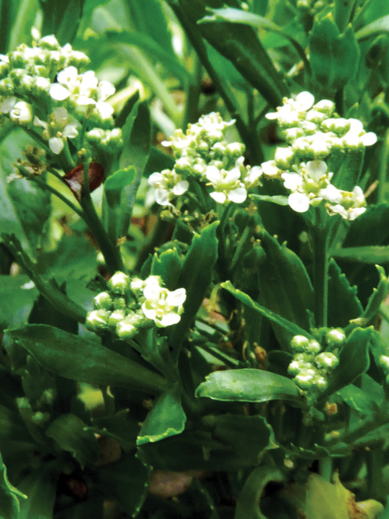 A photograph of Lepidium oleraceum, showing its shiny green leaves and bunches of small white flowers. Nau or Scurvy Grass (Lepidium oleraceum) was used by ship crews visiting Aotearoa New Zealand, in the 1700–1800s, to help prevent scurvy. The crew were grateful for its medicinal purposes.
