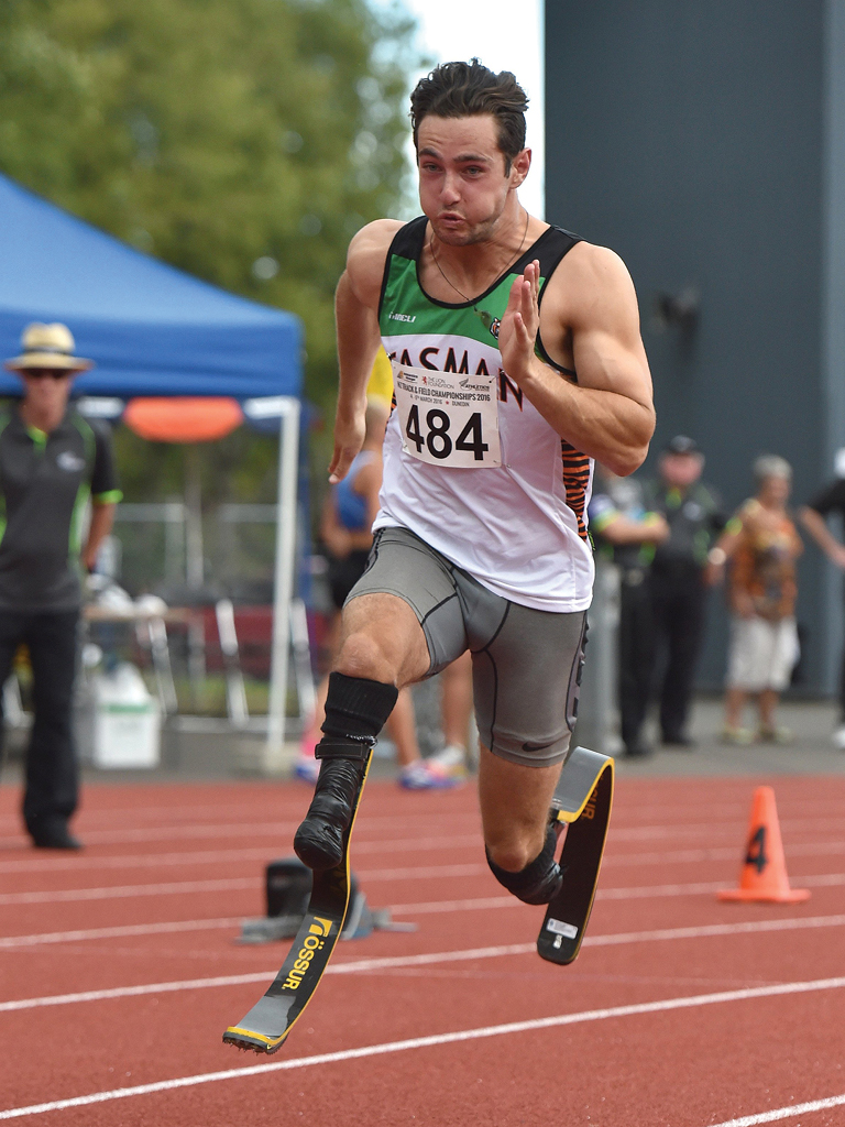 Liam Malone, Paralympic sprint champion, races on blades at a New Zealand athletics competition. Liam won Paralympic gold in the 200 and 400 and silver in the 100 metre sprints, Rio de Janeiro 2016.