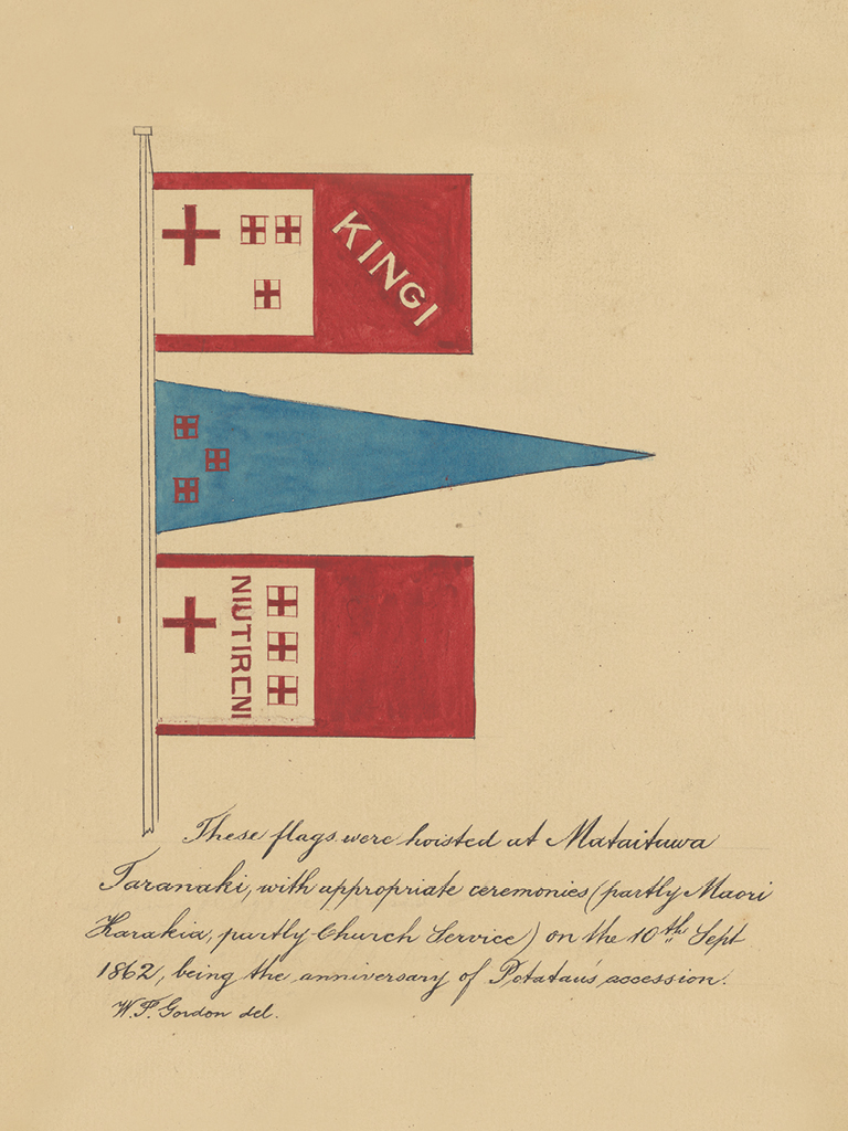 The flag of the Kīngitanga, 1862. This coloured sketch shows three flags: a rectangular red and white flag with four crosses and the word KĪNGI; a blue triangular flag with three red boxed crosses; and a second rectangular red and white flag with four crosses and the words NIU TIRENI. Alongside the sketch is the note, “These flags were hoisted at Mataitawa, Taranaki, with appropriate ceremonies (partly Māori Karakia, partly Church Service) on the 10th September 1862, being the anniversary of Potatau’s succession.”