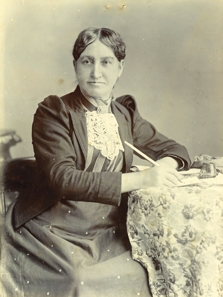 Elizabeth Yates, first woman in the British Empire to hold the office of mayor (Onehunga), 1894. This photograph shows her sitting at a cloth covered table with a pen, poised to write.