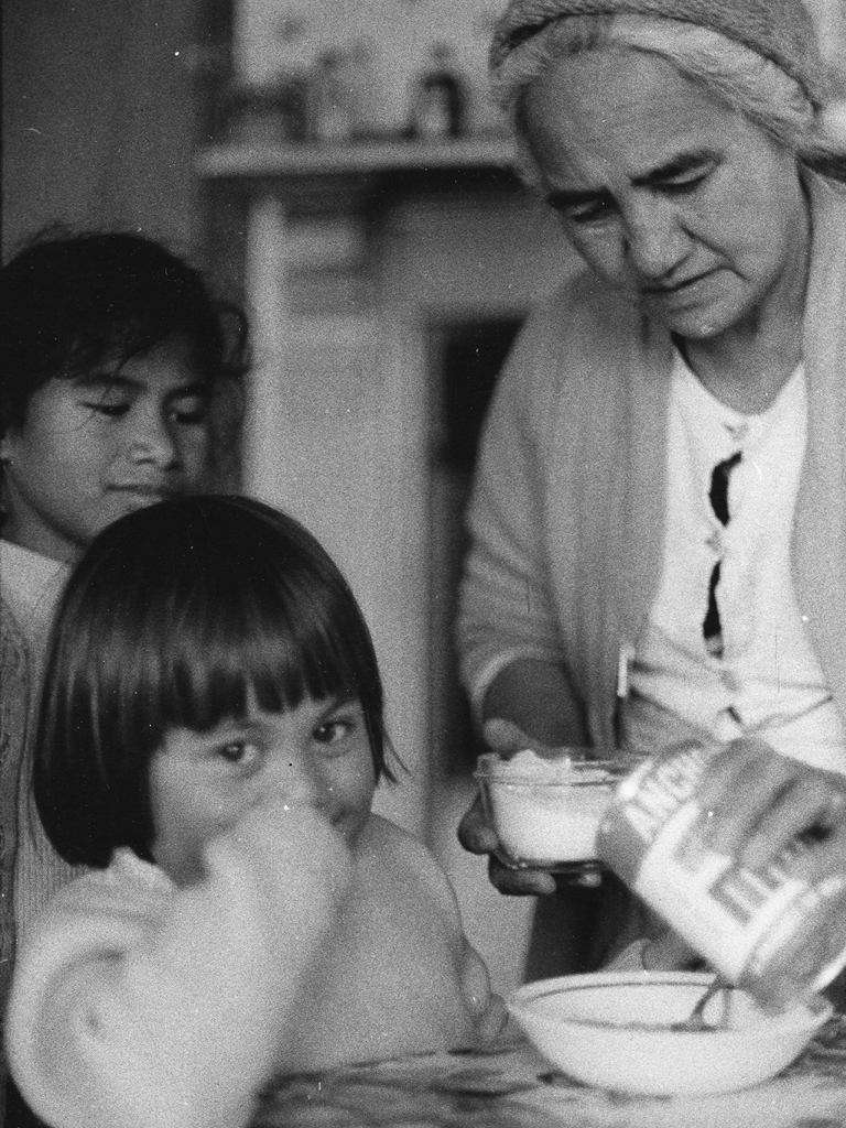 E mātaki ana ētahi tamariki pakupaku tokorua i tētahi kuia e riringi ana i te miraka whakaranu ki tētahi pereti kānga waru.