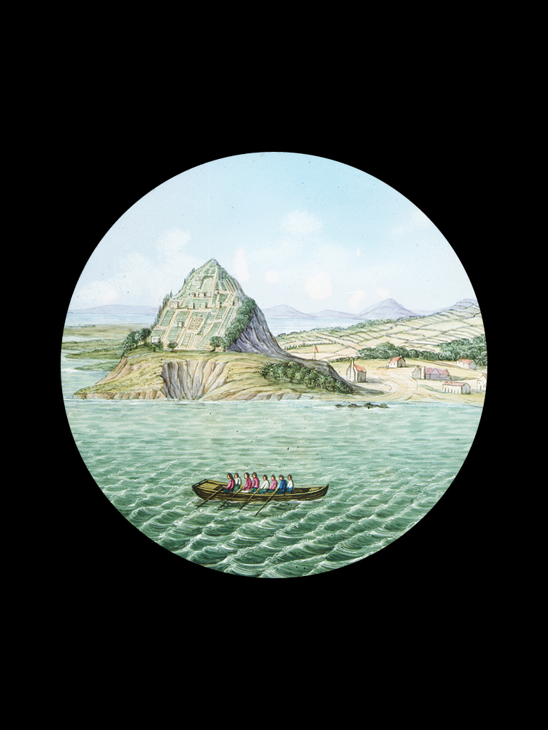Ko Te Pā o Rangihoua (mauī) me te Mīhana o Ōihi, takiwā o 1830–32. Kua oti tēnei pā te hanga i tētahi kūrae, ā, kei ngā hiwi ōna māra; e tū ana tētahi whare karakia me ētahi atu whare i raro iho, tūtata ki te pā. He waka kei te wai, ā, he mau kākahu kano-tini ngā tāngata.