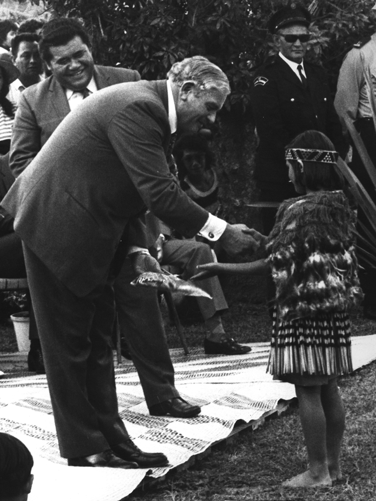 Prime Minister Norman Kirk and MP Matiu Rata, Hairini Marae, Tauranga. A young Māori girl has given the Prime Minister a gift and they are shaking hands. The girl is wearing a piupiu and a kahu huruhuru.