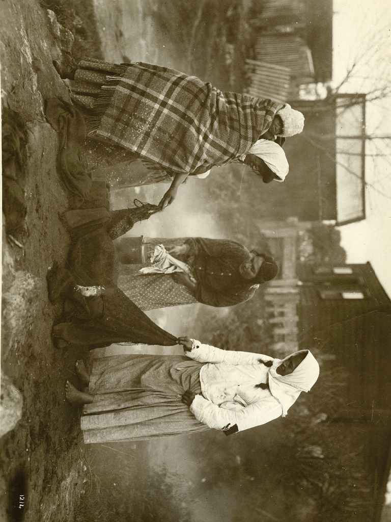 E tao kai ana ētahi wāhine Māori tokotoru i tētahi kōwhāwhā mamaoa, ā, e mau kākahu mahana ana rātou. He kōhungahunga e wahaina ana e tētahi, he mea pōkai ki te paraikete wūru.
