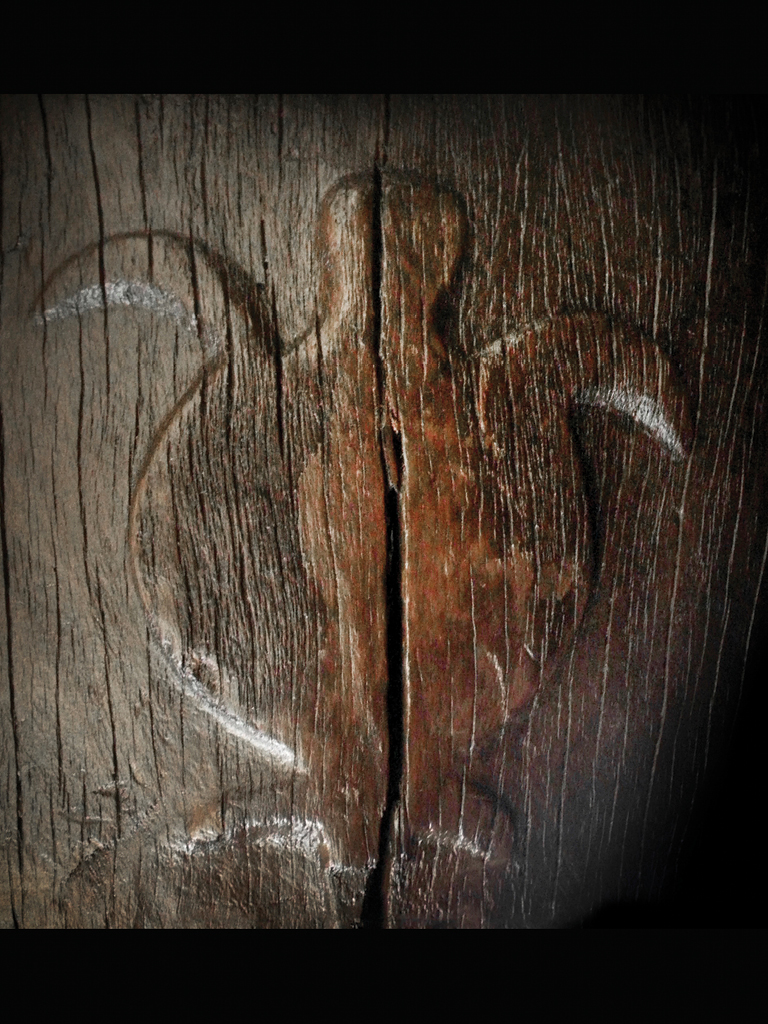 A turtle carved on the Anaweka waka, which is the oldest waka found in Aotearoa New Zealand.